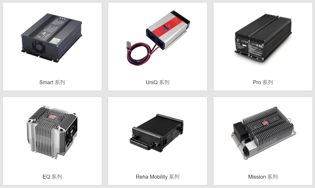 除此之外的主要標準品充電器有7大系列:Smart系列、UniQ系列、Pro系列、 EQ系列、Reha系列、Mission系列和N系列,全面覆蓋工程機械、高空作業(yè)平臺,環(huán)衛(wèi)清潔車、洗地機、掃地機、AGV、機器人、輪椅、代步車、觀光車、物流叉車、園藝護理設備、農用機械、機場地勤設備等領域以電池為動力的設備和低速車的充電。