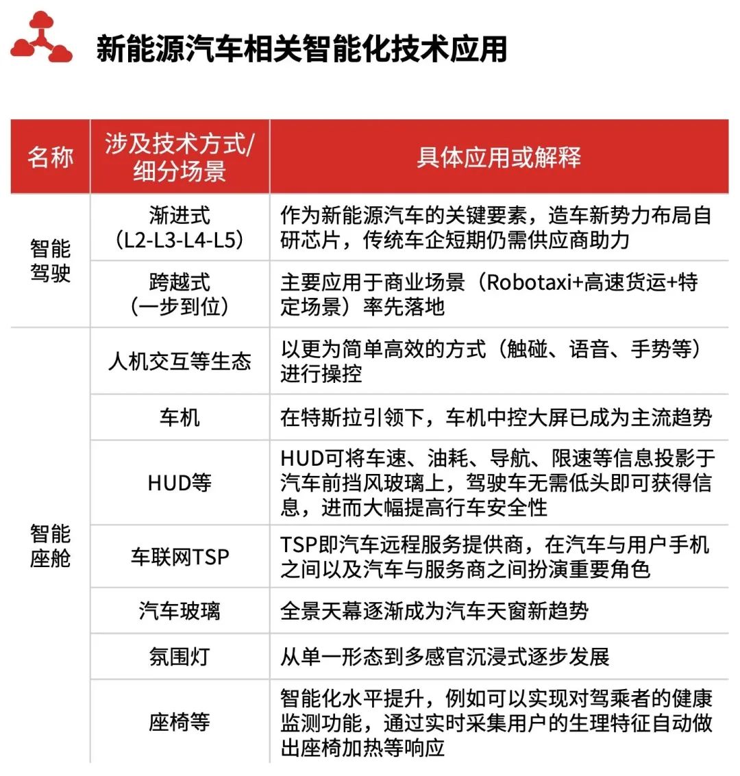 新能源汽車涉及的相關(guān)智能化應(yīng)用非常繁雜,但具體歸類可將其簡要分為智能駕駛相關(guān)應(yīng)用與智能座艙相關(guān)應(yīng)用兩大分類;具體細(xì)分上,智能駕駛分為漸進(jìn)式與跨越式兩種形態(tài),智能座艙包括人機(jī)交互、車機(jī)、HUD等細(xì)分應(yīng)用。